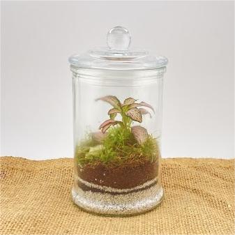 Piccolo terrario con una piccola fittonia dalle variegature rosa